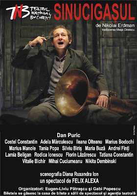Am avut ocazia să merg la una din piesele de teatru pe care mi le doresc de mult: Sinucigașul, de Nikolai Erdman în regia lui Felix Alexa. Piesa îl are ca actor principal pe Dan Puric, în rolul sinucigașului Semion Semionovici Podsekalnikov. Îl urmăresc pe Dan Puric de mult și îmi doream tare mult să îl vad și la teatru. Astăzi am reușit și sunt foarte bucuros. În plus simt că am plecat de la piesă cu ceva în plus. Dan Puric în Sinucigașul este fantastic. De fapt, Dar Puric este un tip fantastic, în general.