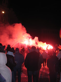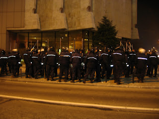 3. Participanții de la meetingul organizat de opoziție astăzi și care voit sau „la impuse” au decis să vină în Piața Universității. La prima vedere par protestatari obișnuiți, dar dacă te uiți cu atenție reușești să îi identifici. Merg în grup (mare), au banere într-o singură direcție (anti-Base) și par omogeni ca vârstă și categorie socială (observația asta e puțin riscantă întrucât era seară și în mulțime nu am putut să îi văd chiar pe toți).